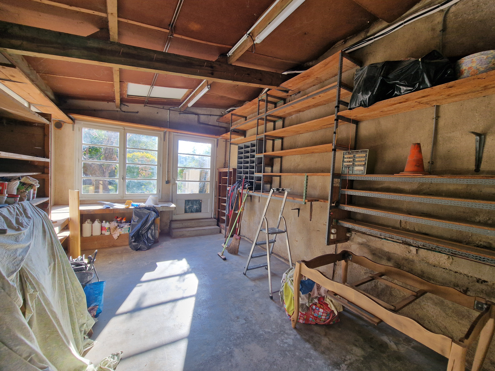 Au rez-de-chaussée, vous découvrirez une spacieuse pièce de vie de 45 m² avec cuisine ouverte, une arrière-cuisine avec espace buanderie, une salle d’eau avec WC, ainsi qu’un grand atelier offrant un bel espace de stockage ou de bricolage.